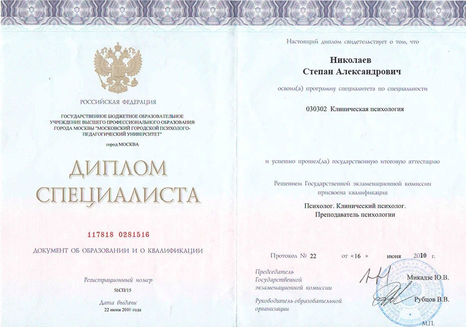 • 2010 — ГБОУ ВПО «Московский городской психолого-педагогический университет» (клиническая психология)